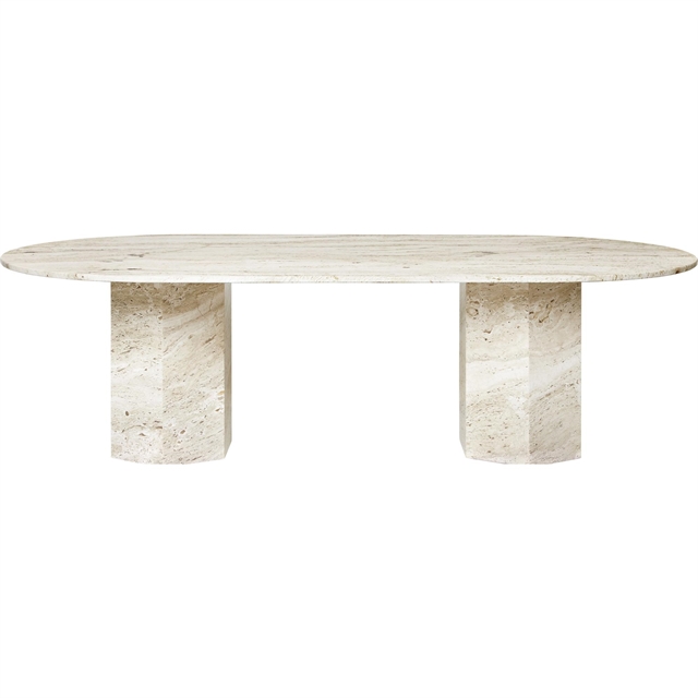 Der Esstisch Epic von Gubi besteht aus massivem Naturstein und zeichnet sich durch seine elliptische Tischplatte und seine schwere, monolithische Struktur aus. Der weiße Travertin zeigt sich mit offenen Poren, Fossilienabdrücken und natürlicher Maserung, die von Tisch zu Tisch variieren und jedes Stück zu einem Unikat machen. Der Stein wird aufgrund seiner besonderen strukturellen Eigenschaften ausgewählt und mit Respekt vor Herkunft, Gewicht und Oberfläche des Materials verarbeitet, was dem Tisch einen unverwechselbaren und kompromisslosen Charakter verleiht. Die Epic-Serie basiert auf klassischen Architekturreferenzen und arbeitet mit klaren geometrischen Formen in massiven Materialien, wobei Proportionen und Gewicht integriert Bestandteil des Ausdrucks sind. Der Esstisch ist Teil der Epic-Kollektion und wird von Gubi als Einzelstück aus Naturstein gefertigt.